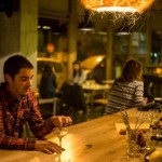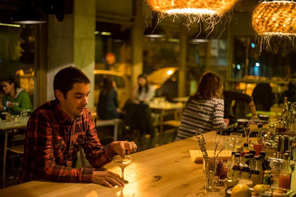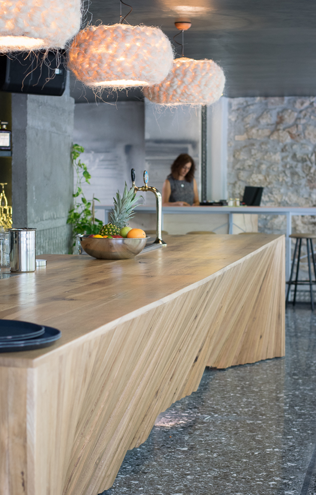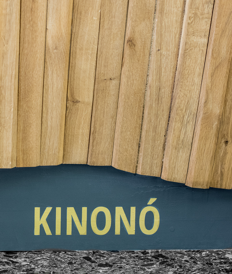 Το KINONÓ είναι ευρύχωρο. Αυτό είναι το πρώτο πράγμα που σκέφτηκα μπαίνοντας στον νέο χώρο της Όλγας Μανέτα στο Κουκάκι. Δεν είναι μικρό πράγμα αυτός ο χαρακτηρισμός. Συνήθως όταν μπαίνεις σε ένα café ή μπαρ νιώθεις ότι ο ιδιοκτήτης έκανε τα πάντα για να εκμεταλλευτεί κάθε διαθέσιμο τετραγωνικό εκατοστό του χώρου εις βάρος της άνεσης και υπέρ του «ας τους στριμώξω όσο γίνεται αρκεί να χωράνε περισσότεροι». Στο ΚΙΝΟΝÓ δεν υπάρχει αυτή η φιλοσοφία. Το καταλαβαίνεις και από τον τίτλο, το καταλαβαίνεις και από τον χώρο, ο οποίος διαμορφώθηκε με την πολύτιμη συμβολή του αρχιτεκτονικού ντουέτου Nullstellen Laboratory (που έχουν επιμεληθεί και το Some Bizzare). Το “Κοινωνώ” με την έννοια του “συμμετέχω”, μαζί με αυτό το ιαπωνικό παιχνίδισμα που υπογραμμίζει τη λιτότητα του χώρου είναι πραγματικά εμπνευσμένος τίτλος. Το πρώτο που ξεχωρίζεις είναι η ξύλινη μπάρα που αποτελείται από 200 κομμάτια και δίνει την αίσθηση κυματισμού, όχι δεν έχεις πιεί πολλά κοκτέιλ είναι πράγματι έτσι.  Η μπάρα όπως και όλα τα έπιπλα (τραπέζια, καρέκλες) είναι κατασκευασμένα από την Όλγα που ξεκίνησε ως ηθοποιός, μετά άνοιξε το Kinky, ύστερα ήταν συνιδιοκτήτρια του 6 D.O.G.S κι όταν έκλεισε κι αυτός ο κύκλος αφιερώθηκε για δύο χρόνια στο σπίτι της και στο ξύλο. Το ανακαίνισε από την αρχή, έφτιαξε μόνη της όλα τα έπιπλα του και άρχισε να κατασκευάζει έπιπλα και για άλλους. «Αγαπώ το ξύλο, από μικρή όταν πήγαινα στις παραλίες κι έβρισκα κάποιο κλαδι, το έπαιρνα στο σπίτι μου και κάτι έφτιαχνα. Το ξύλο είναι ζωντανό, θέλει περιποίηση και σεβασμό για να αντέξει, δεν λουστράρω τα έπιπλα αλλά τα περνάω με κερί, μάλιστα τα κρεβάτια τα περνάω με κερί πορτοκαλιάς και μυρίζει υπέροχα».